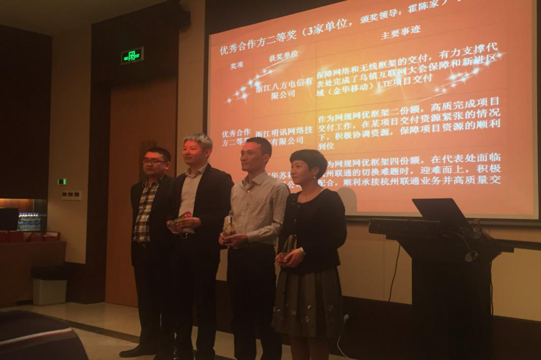 本次會議根據合作方的交付質量、對客戶滿意度的的調查以及合作資源認證率等方面對各個合作方做出了中肯切實的評價,其中,華蘇科技 不負華為代表處對合作方的殷殷期待,以其杰出的綜合表現獲得了“2015年度華為公司杭州代表處優秀合作伙伴二等獎”的殊榮,同時還受到了“面對難題,迎難而上,積極配合,交付質量高”的良好評價。這是對華蘇2015年付出的所有努力的最好認可,同時也激發了我們在2016年更要長風破浪、攜手共進的決心和動力。