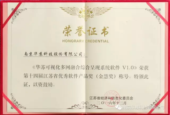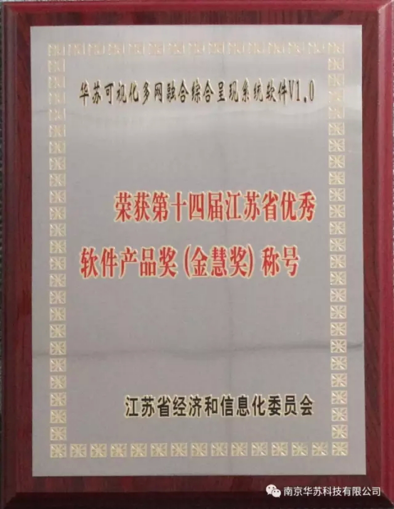 南京華蘇 科技有限公司開發(fā)的”可視化多網(wǎng)融合綜合呈現(xiàn)系統(tǒng)軟件“榮獲第十四屆江蘇省優(yōu)秀軟件產(chǎn)品獎(金慧獎)。