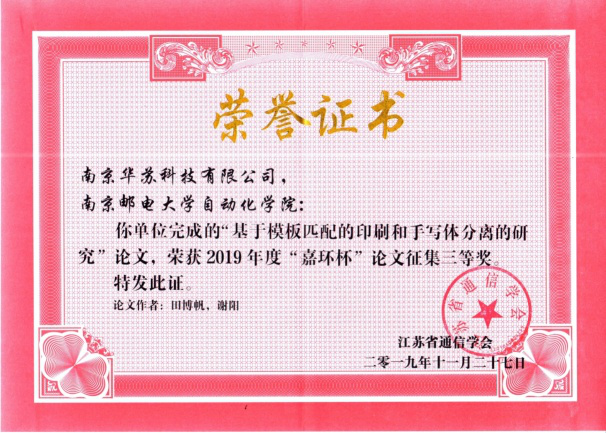 :2019年11月27日下午,由江蘇省通信管理局指導、江蘇省通信學會主辦的第四屆江蘇省信息通信行業青年學術論壇盛大召開。華蘇科技應邀出席并榮獲2019年度江蘇省通信學會論文征集一等獎、三等獎。