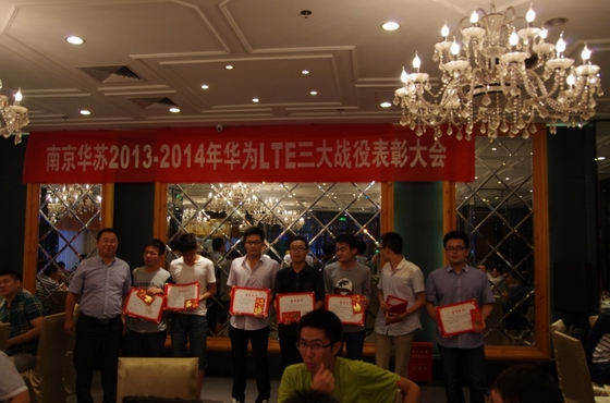 優(yōu)異的成績離不開辛勤奮斗在一線的戰(zhàn)士們,為繼續(xù)發(fā)揚不怕吃苦、肯學(xué)肯干的精神,項目組特此在青奧會保障結(jié)束之際,舉行“南京華蘇2013~2014華為LTE三大戰(zhàn)役表彰大會",邀請公司領(lǐng)導(dǎo)前來慰問以及發(fā)表重要講話,表彰項目上的優(yōu)秀新人以及優(yōu)秀員工,宴請項目上所有的兄弟姐妹相聚在一起,以激勵員工再接再厲,再創(chuàng)佳績。最后本次大會也在大家的歡聲笑語中圓滿落下帷幕。