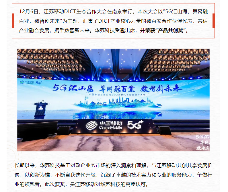 華蘇科技榮獲江蘇移動(dòng)2023DICT生態(tài)合作“產(chǎn)品共創(chuàng)獎(jiǎng)”