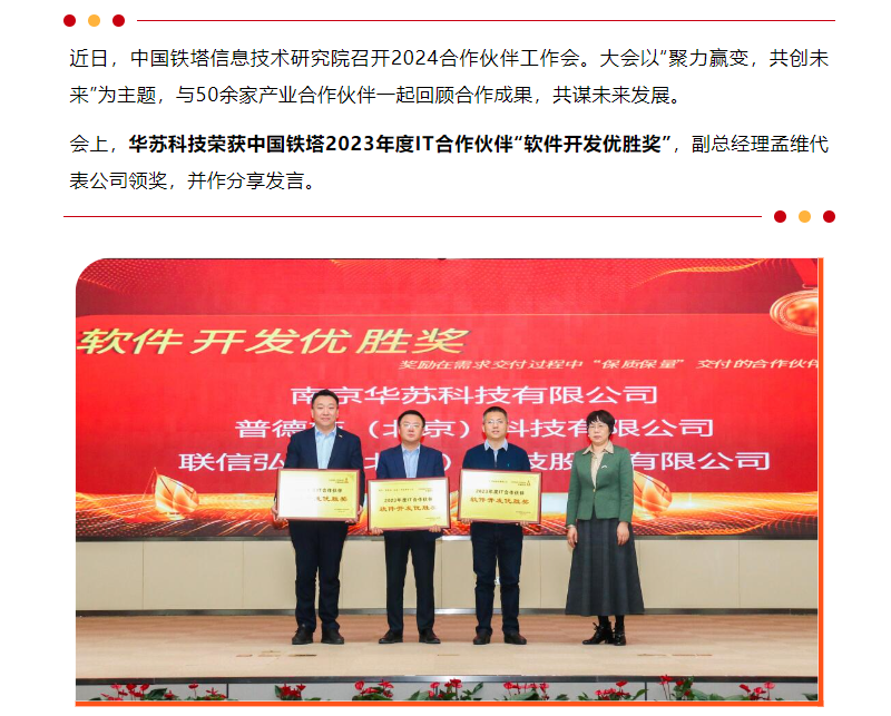 華蘇科技榮獲中國鐵塔2023年度IT合作伙伴“軟件開發優勝獎”